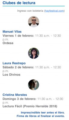 Manuel Vivas, Laura Restrepo y Cristina Morales acompañarán en los Clubes de lecturas, estos permitirán el ingreso de las personas que tengan las boletas. Es imprescindible leer el libro con anterioridad.