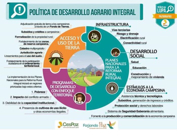 En la Reforma Rural Integral destacar los 16 Planes Nacionales de la Reforma Rural Integral - PNRRI que si bien han sido la gran deuda que ha tenido los gobiernos anteriores con implementación del acuerdo de Paz y se han confundido en su mayoría con la histórica oferta institucional de los 10 ministerios, entidades y sectores del Estado colombiano encargados de estos planes, tienen un alcance específico diseñado en el acuerdo de Paz, con indicadores específicos en el Plan Marco de Implementación.