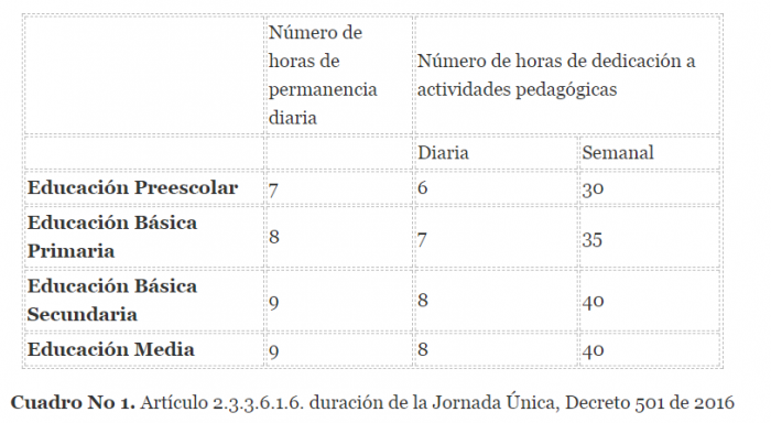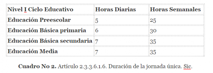 Esto quiere decir que mientras el Decreto 501 de 2016 plantea la duración de la jornada única en horario entre las 6 y 30 de la mañana hasta las 2 y 30 p.m, en promedio, el decreto 2105 de 2017, las reduce hasta las 1 y 30 p.m.