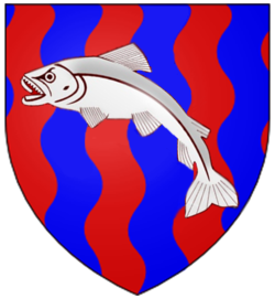 Símbolo: Una trucha plateada, saltando sobre campo ondulado de azur y gules