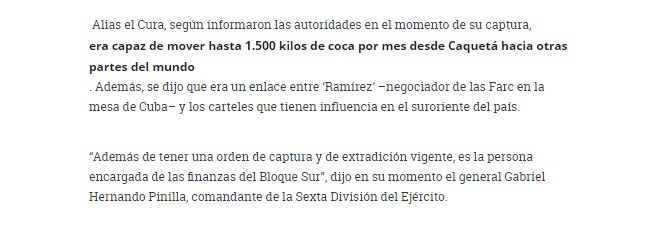Eduardo Cabrera, el Cura. Es el hermano de Fabián Ramírez, comandante del Estado Central de las FARC. Lo capturaron por mover traficar con cocaína, pero era uno de los jefes de finanzas del Bloque Sur. Tiene orden de extradición suspendida.
