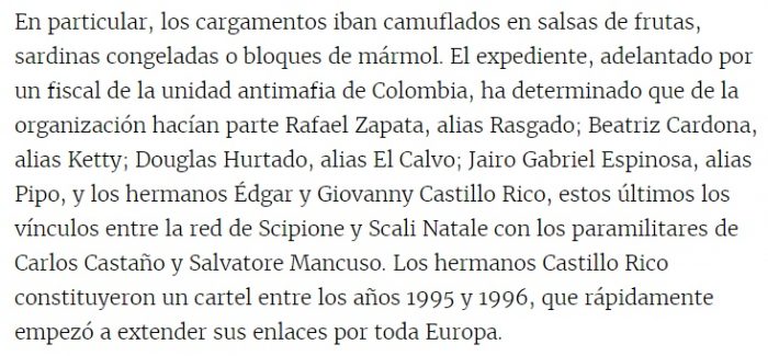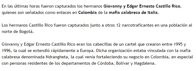 Los hermanos Giovanny y Édgar Castillo Rico caminaban por el norte de Bogotá cuando los capturaron. Lo que se conoció después parecía una película de Scorsese: estos hermanos dirigían un cartel de narcos que funcionaba de puente entre Salvatore Mancuso y Carlos Castaño, con Santo Scipione y Scali Natale, los líderes de la mafia calabresa. A mediados de los 90 los hermanos salieron de la sombra de las AUC y montaron su propio negocio: inundar las calles de Italia de cocaína que le compraban al Bloque Catatumbo, liderado por Mancuso.
