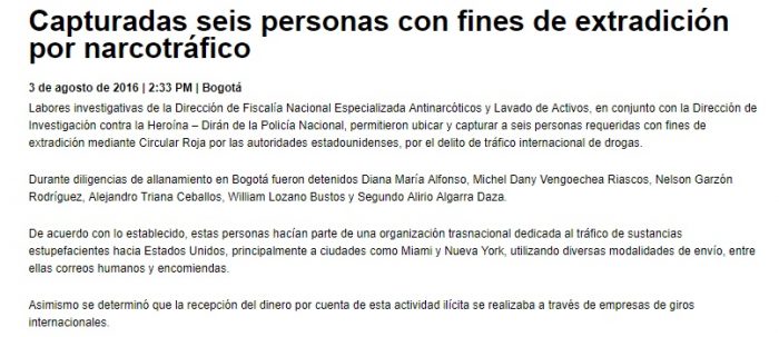Franklin Mosquera. Narco que tenía lazos con bandas criminales. En julio se conoció que el Consejo Seccional de la Judicatura de Bogotá ordenó a Santos suspender la extradición para verificar si era de las FARC. Había sido contratista de Departamento Administrativo de Prosperidad Social en Turbo, Antioquia.